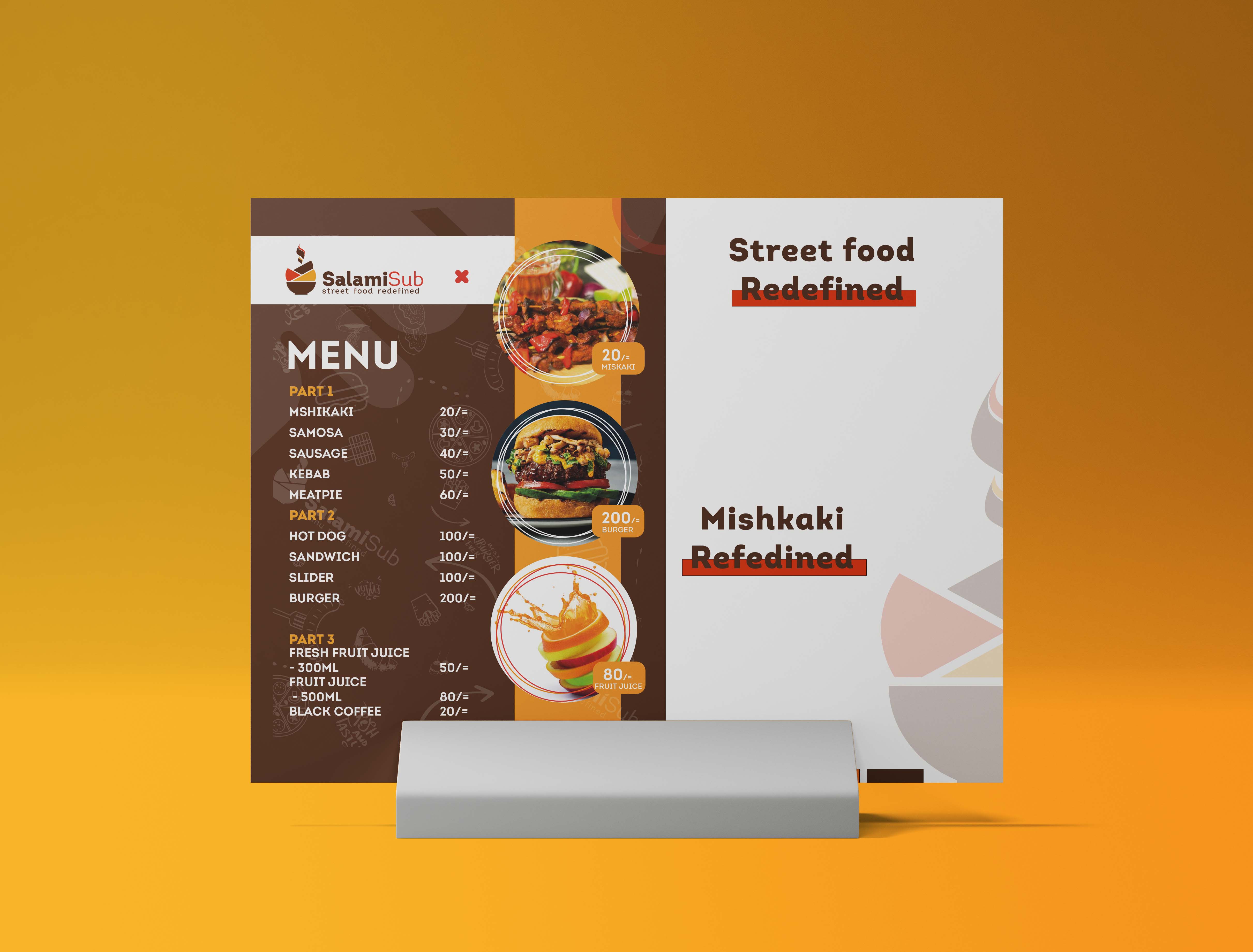 They aim to expand and create a strong presence not just in Nakuru but across major cities. To achieve this, Salami-Sub should be bold, distinct and easy to place, trace and interpret. To capture attention, vibrance will be a major factor especially since the main target is youths. Salami-Sub as a fast food serves finger licking inexpensive food and drinks. This makes it affordable and relatable for the common mwananchi. The foods are from local recipes but with a great modern touch, giving it a unique taste- hence the redefinition- street food redefined.
